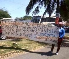 La mujer recorre calles, avenidas y cruceros de la zona conurbada Veracruz-Boca del Río-Medellín de Bravo, cartulina en mano, a fin de conseguir recursos para comprar su medicamento