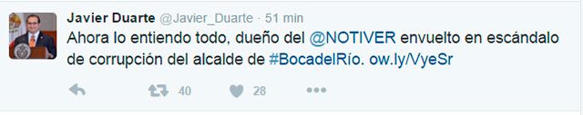 Lo relevante de esta compra-venta es el apunte que le pone el gobernador del estado Javier Duarte de Ochoa en un tuit difundido a las 19:15 horas de este domingo en el que dice: “Ahora lo entiendo todo, dueño del Notiver envuelto en escándalo de corrupción del alcalde de Boca del Río”.