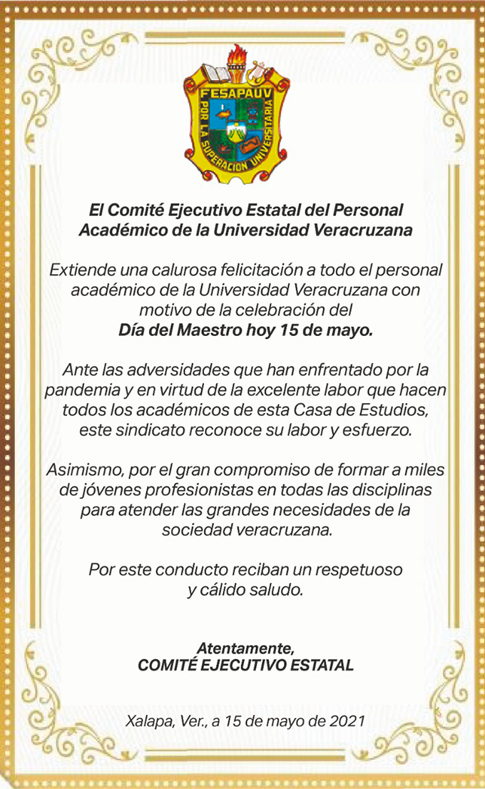 Extiende una calurosa felicitación a todo el personal académico de la Universidad Veracruzana con motivo de la celebración del