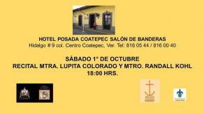 Se trató de un recital encabezado por la voz de la soprano Guadalupe Colorado y la guitarra de Randall Kohl, con un repertorio de obras cuyos autores representaron varias regiones de Iberoamérica, como el español Joaquín Rodrigo; Ernesto Cordero, un compositor de Puerto Rico; el mexicano Octaviano Yáñez; Julio César Oliva, uno de los guitarristas más importantes y connotados especializados en la poesía de Jaime Sabines; así como el cubano Leo Brouwer.