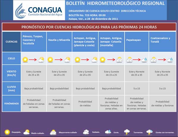 Se espera que a partir de este día y hasta el próximo domingo las condiciones atmosféricas estén supeditadas a la entrada de aire marítimo tropical hacia la región, esto es, cielo despejado a medio nublado, baja probabilidad de lluvias, así como una recuperación gradual de la temperatura diurna.
