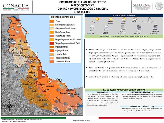 El flujo de humedad proveniente del Golfo de México hacia el interior de la vertiente oriental del país, así como la presencia de un canal de baja presión localizado al sureste del mismo Golfo, favorecerá cielo medio nublado a nublado durante el día acompañado de precipitaciones acumuladas puntualmente intensas (75 a 150 mm) por la tarde y noche sobre las regiones altas de los ríos Antigua, Jamapa-Cotaxtla, Papaloapan, Coatzacoalcos y Tonalá; para las zonas altas de las cuencas de los ríos Cazones, Tecolutla, Misantla y Actopan se esperan lluvias acumuladas muy fuertes (50 a 75 mm), mientras para las cuencas altas de los ríos Pánuco, Tuxpan y sobre la regiones costeras se esperarían acumulados fuertes (25 a 50 mm). El viento se registrará del Este y Sureste para la zona norte y sur y del Noreste para la zona sur de la entidad veracruzana, ambos casos con velocidad de 15 a 25 km/h. El ambiente durante el día se presentará cálido sobre zonas montañosas y cálido a caluroso en zonas de planicie y costa.