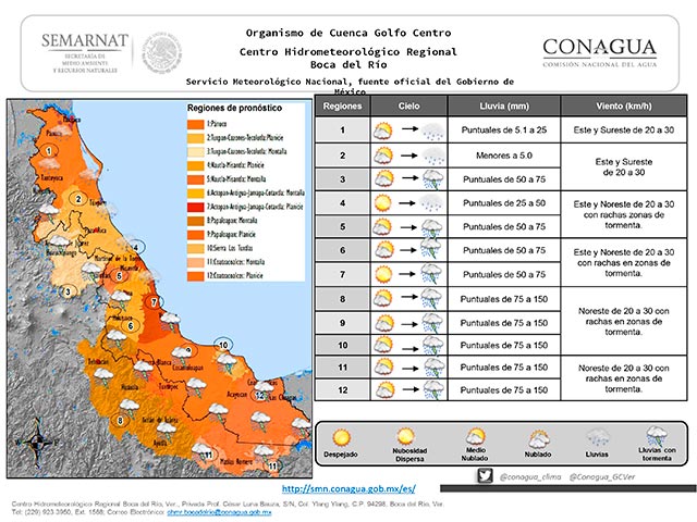 El ambiente diurno cálido y bochornoso se espera durante este día en el estado de Veracruz, extreme precauciones por la tarde-noche ante la presencia de lluvias moderadas y algunas localmente fuertes en especial en zonas de montaña y porción sur.