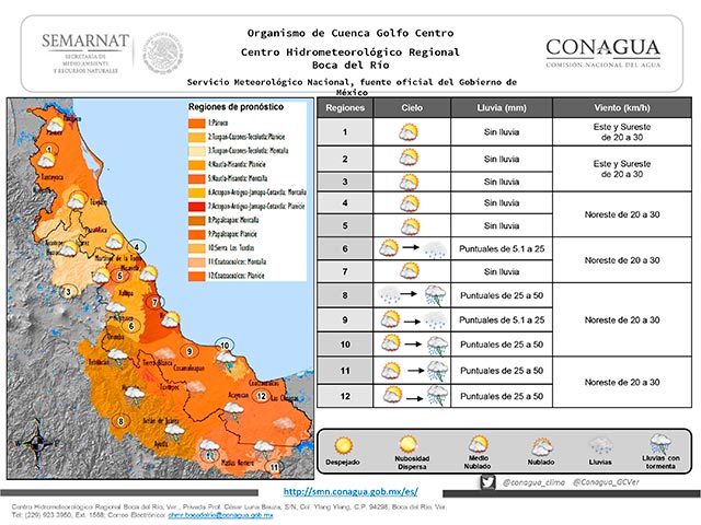 Esta mañana la vaguada sobre el suroeste del Golfo de México y la presencia del frente número 45 estacionado en el norte-centro del mismo Golfo, favorecen nublados con potencial de lluvias especialmente en la zona sur y de menor importancia en la zona montañosa central, en el resto del Estado se observa cielo despejado con bajo potencial de lluvias.