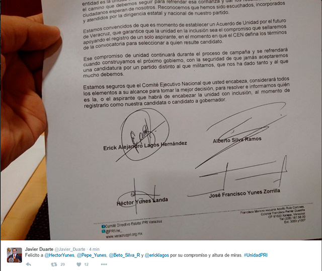 El gobernador Javier Duarte de Ochoa, tuiteó este domingo un oficio dirigido al presidente nacional del PRI, Manlio Fabio Beltrones, en donde cuatro de los aspirantes a la gubernatura del Estado firman un “Acuerdo de Unidad por el futuro de Veracruz”, donde se comprometen a apoyar al candidato que sea elegido por su partido y no contender por ningún otro instituto político que no sea el tricolor.