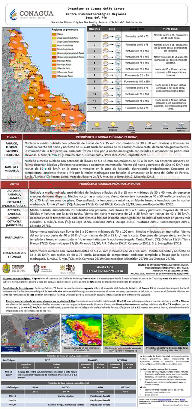 Asimismo, la interacción del frente frío número 13 estacionado en el suroeste del mismo Golfo con la Depresión Tropical Iota sobre el Salvador, genera condiciones para lluvias importantes en el sur de Veracruz en donde podrían presentarse puntuales mayores de 50 a 100 milímetros (cuencas del Papaloapan al Tonalá); mientras que en la zona norte podrían ser de 30 a 50 milímetros de forma dispersa.