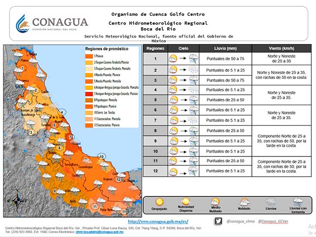 Se prevé que un nuevo frente frío (No. 62) ingrese al noroeste del Golfo de México durante este día. Se desplazará al este-sureste, esperándose alcance el centro de Tamaulipas y el norte del Golfo de México por la tarde. Estará acompañado de una vaguada prefrontal delante del mismo. Ambos sistemas favorecerán el desarrollo de nublados y del potencial para tormentas puntuales fuertes (25 a 50 mm) en el norte, occidente y sur de Tamaulipas, así como lloviznas y chubascos dispersos (5.1 a 25 mm) en el resto de la entidad. Sobre regiones de montaña de la entidad veracruzana se prevén lloviznas aisladas con chubascos dispersos (5.1 a 25 mm), desde el Pánuco hasta el Coatzacoalcos, previendo se presenten tormentas fuertes (25 a 50 mm) a puntuales muy fuertes (50 a 75 mm) en partes altas de las cuencas del Pánuco, Tuxpan, Cazones, Tecolutla, Nautla, Misantla, Actopan, Papaloapan y Coatzacoalcos. Las lluvias estarán acompañadas de descargas eléctricas y viento en rachas en zonas de tormenta.
