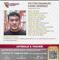 Como se informara la Comisión Estatal de Búsqueda habían emitido una alerta de desaparición de Víctor Emanuel Cano Jiménez, de 15 años, su familia pedía la colaboración de la ciudadanía para dar con su paradero. Lamentablemente esta noche de lunes trascendió que Víctor Emanuel Cano Jiménez fue encontrado sin vida en un barranco en el cauce un río cerca del poblado de la Estanzuela.