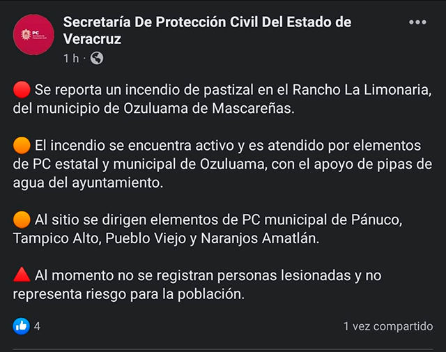 Ozuluama, Ver., 25 de marzo de 2022.- Este viernes se reportó un incendio de gran magnitud en la zona del Rancho La Limonaria, el cual está consumiendo una gran extensión territorial. Autoridades reportan que a las labores de sofocación se han unido las unidades de PC de los municipios de Álamo, Tampico Alto, Pueblo Viejo y Amatlán.