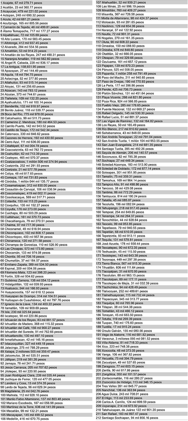Con base al Acuerdo aprobado, el tope de gastos de campaña para la elección de ayuntamientos, de 48 millones 196 mil 187.20 pesos, se distribuirá entre los 212 municipios, de la siguiente forma: