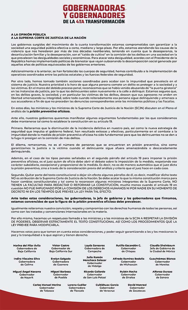 En un comunicado conjunto, las gobernadoras, los gobernadores y la jefa de gobierno de MORENA exhortaron a los ministros de la Suprema Corte a respetar la Constitución pues no tienen la facultad para modificarla, por lo que el Artículo 19 de la Carta Magna debe prevalecer en sus términos.