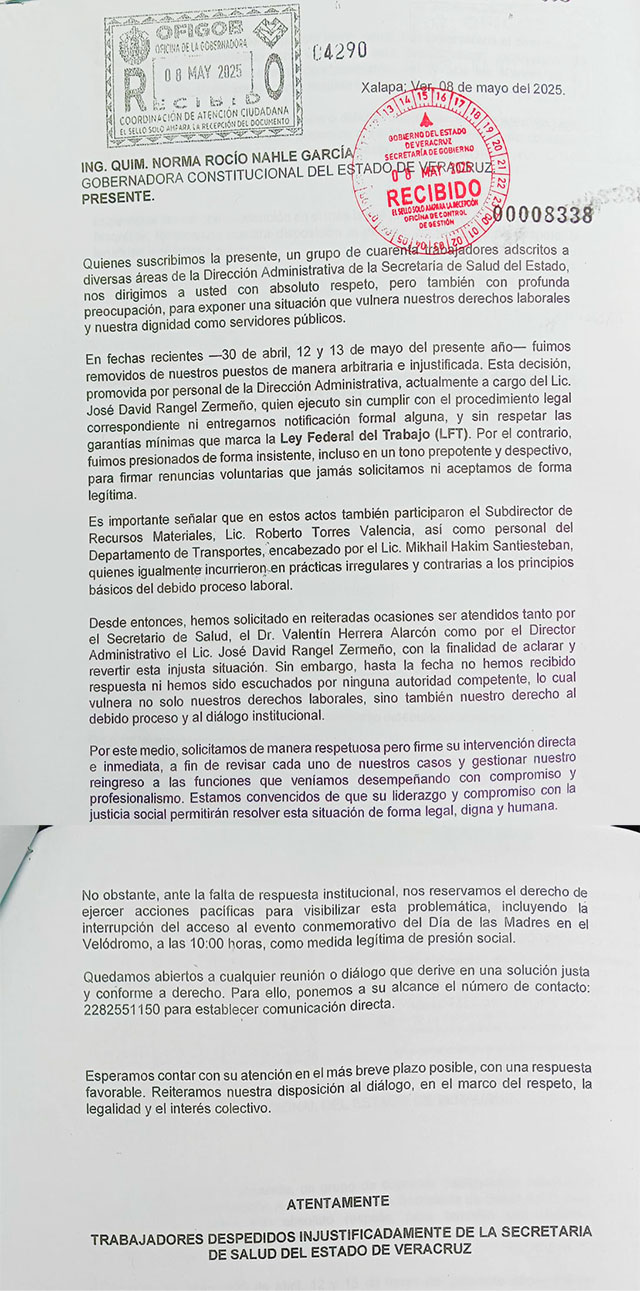“Fuimos removidos de nuestros puestos de manera arbitraria e injustificada”, afirmaron en una carta dirigida a la gobernadora Rocío Nahle García. “Esta decisión, promovida por personal de la Dirección Administrativa, actualmente a cargo del Lic. José David Rangel Zermeño, se ejecutó sin cumplir con el procedimiento legal correspondiente ni entregarnos notificación formal alguna”, dijeron.