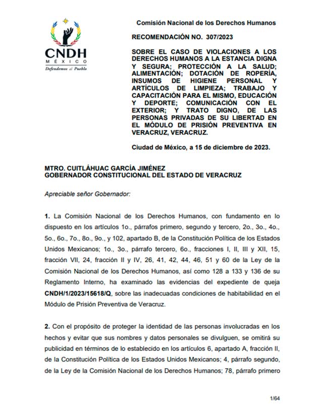 “Se trata de la recomendación 307/2023, emitida el 15 de diciembre pasado, donde se señala sobre violaciones a los derechos humanos como una estancia digna y segura, protección a la salud, alimentación; dotación de ropería, insumos de higiene personal y artículos de limpieza; trabajo y capacitación para el mismo, educación y deporte; comunicación con el exterior y trato digno”, finalizó.