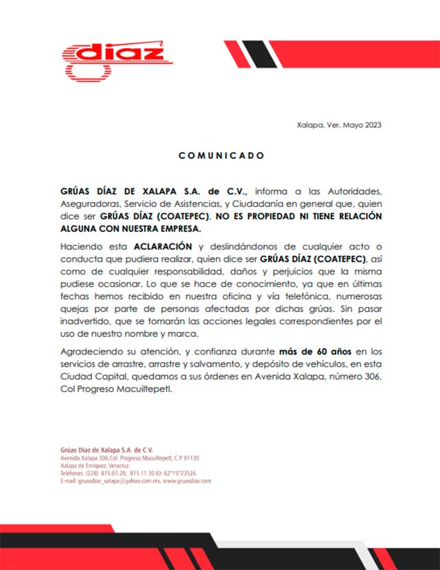 “Grúas Díaz (Coatepec) no es propiedad ni tiene relación alguna con nuestra empresa”, aclaran