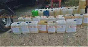 Oficiales confiscaron 36 garrafas de combustible en predio sobre costado de la carretera Tuxpan-Cazones.
