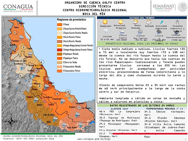 Se espera que en el transcurso de este día la zona de baja presión al sur del estado de Veracruz continúe semi-estacionaria y fortaleciéndose (costa fuera frente al sur de la entidad veracruzana). Esta estará asociada con un canal de baja presión extendido al oeste-suroeste del Golfo de México, manteniendo el potencial de lluvias fuertes (50 a 75 mm) a localmente muy fuertes (75 a 150 mm) desde la cuenca del río Tuxpan hasta la cuenca del río Tonalá. No se descarta que hacia las cuencas de los ríos Papaloapan, Coatzacoalcos y Tonalá puedan presentarse lluvias cercanas a los 200 mm. Las lluvias podrán ir acompañadas por actividad eléctrica. Existe la posibilidad de que estas lluvias se presenten de forma intermitente a lo largo del día y como chubascos durante la tarde y noche. El viento será de componente Norte de 25 a 35 km/h con rachas de 60 km/h principalmente a lo largo de la costa centro y sur de Veracruz. La temperatura se mantendrá sin cambios significativos por lo que el ambiente estará fresco a templado en zonas de montaña y cálido a caluroso en planicies y costa.