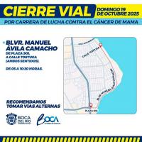 Este domingo 19 de octubre, habrá un cierre vial temporal sobre el bulevar Manuel Ávila Camacho de Boca del Río, con motivo de la Carrera de Lucha Contra el Cáncer de Mama, evento deportivo y de concientización organizado por el Gobierno municipal.