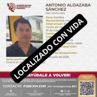 Luego de mes y medio de búsqueda, Antonio Aldazaba Sánchez fue localizado con vida en el estado de Tlaxcala. Autoridades de esa entidad confirmaron el hallazgo y notificaron a la familia del joven xalapeño de 30 años, quien permanecía desaparecido desde el pasado 11 de julio.