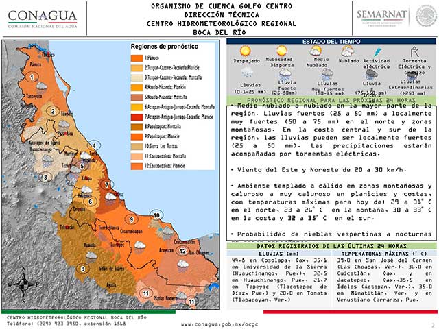 Se espera que el avance de la onda tropical número 11 y el canal de baja presión en el suroeste del Golfo de México, mantengan durante las siguientes 24 horas condiciones de cielo medio nublado a nublado en la mayor parte de la región, así como el potencial de lluvias fuertes (25 a 50 mm) a localmente muy fuertes (50 a 75 mm), especialmente en el norte y zonas montañosas. En la costa central y sur de la región no se descartan lluvias localmente fuertes (25 a 50 mm). Estas precipitaciones serán vespertinas a nocturnas en zonas montañosas y nocturnas a matutinas en la costa y estarán acompañadas por actividad eléctrica. No obstante, la temperatura diurna mantendrá el ambiente templado a cálido en la montaña y caluroso a muy caluroso en planicies y costa de la región.