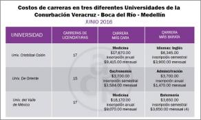 Al hacer un comparativo de las carreras más caras y en contraparte las más baratas, quien pretenda estudiar, por ejemplo, la de medicina en la Universidad Cristóbal Colón de la ciudad de Veracruz deberá pagar 17 mil 670 pesos de inscripción y 12 mensualidades de 9 mil 415 pesos, esto es, 112 mil 980 pesos al año.