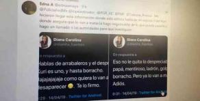La denuncia que fue publicada la madrugada de este domingo, iba acompañada de las capturas de pantalla de la públicación que hizo la usuaria @dianita_fuentes, quien responde presuntamente a Fidel Kuri Mustieles y escribe que su padre es un arrabalero, borracho, despreciable y mentiroso, además que en los twitts, en uno menciona, lo van a desaparecer y, en otro, que lo van a matar.