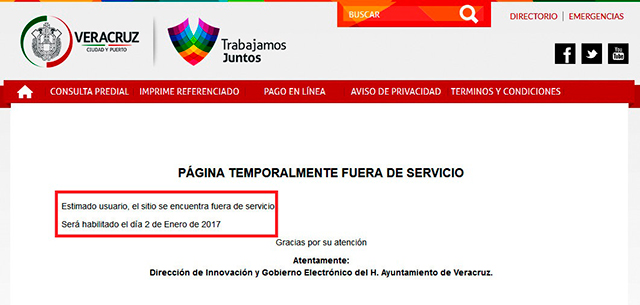 Veracruz, Ver: 14 de diciembre de 2016.- Quienes pretendan conocer vía internet el monto a pagar del impuesto predial 2017 en los municipios de Veracruz y Xalapa, podrán hacerlo hasta el lunes dos de enero. El municipio del puerto así lo advierte y el de la capital del Estado indica página fuera de servicio.