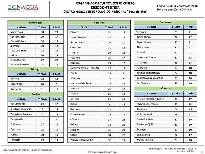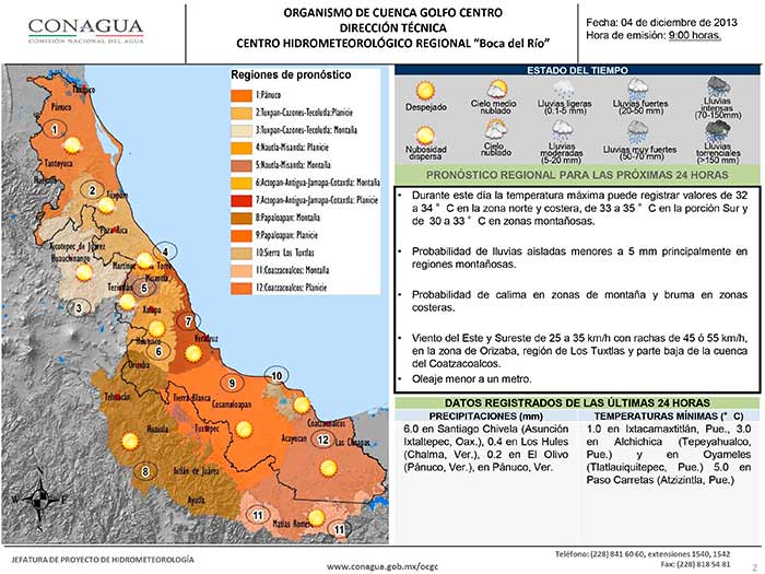 Dominará en la región temperatura diurna alta con probables eventos de “surada” en las zonas de Orizaba, región de Los Tuxtlas y parte baja de la cuenca del Coatzacoalcos durante las madrugadas a primeras horas del día.