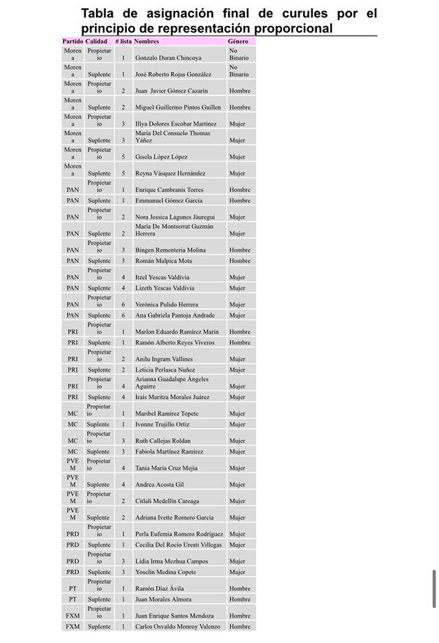 Con estos cambios, la lista final de diputados plurinominales que fue sometida a votación y aprobada por los Consejeros del OPLE es la siguiente: