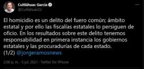 "Es inconsecuente pasar esta responsabilidad directamente al Presidente de la República. Una vez detenida la espiral de violencia, exhorto a mis pares a redoblar esfuerzos y revisar la procuración de justicia para disminuir considerablemente este delito", publicó.