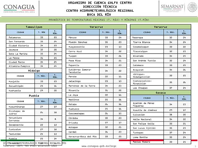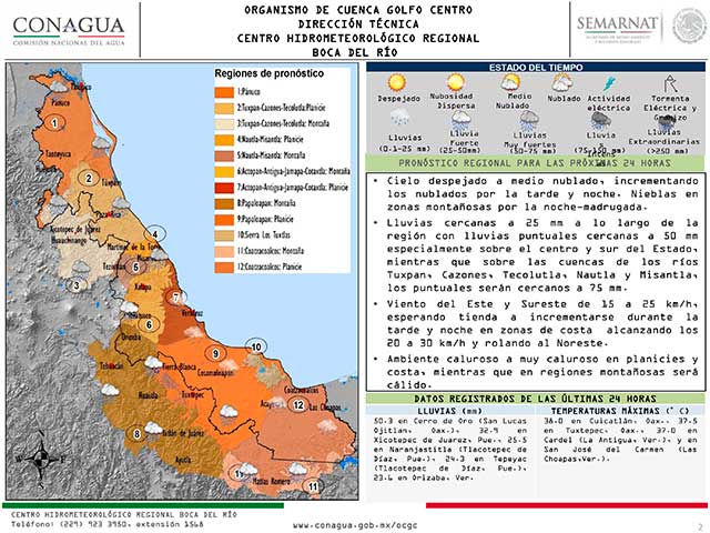 La persistente entrada de aire marítimo tropical hacia la vertiente oriental del País, mantendrá condiciones de tiempo relativamente estable, esto es, cielo despejado a medio nublado con ambiente cálido en zonas montañosas y caluroso a muy caluroso en zonas costeras; en cuanto al potencial de lluvias, se prevén eventos dispersos de 5 a 25 mm a lo largo de la región de pronóstico, esperando que durante esta noche, el frente frío No. 5 se aproxime al Norte del Estado, situación que ocasionará eventos locales muy fuertes (50 a 75 mm), mientras que en el centro y sur de Veracruz, no se descartan puntuales cercanos a 50 mm, especialmente en zonas montañosas, mismos que estarán acompañados por actividad eléctrica. El viento se mantendrá fluyendo del Este y Sureste en el transcurso del día con velocidades de 15 a 25 km/h incrementándose por la tarde y noche alcanzando velocidades de 25 a 35 km/h, y rolando al Noreste.