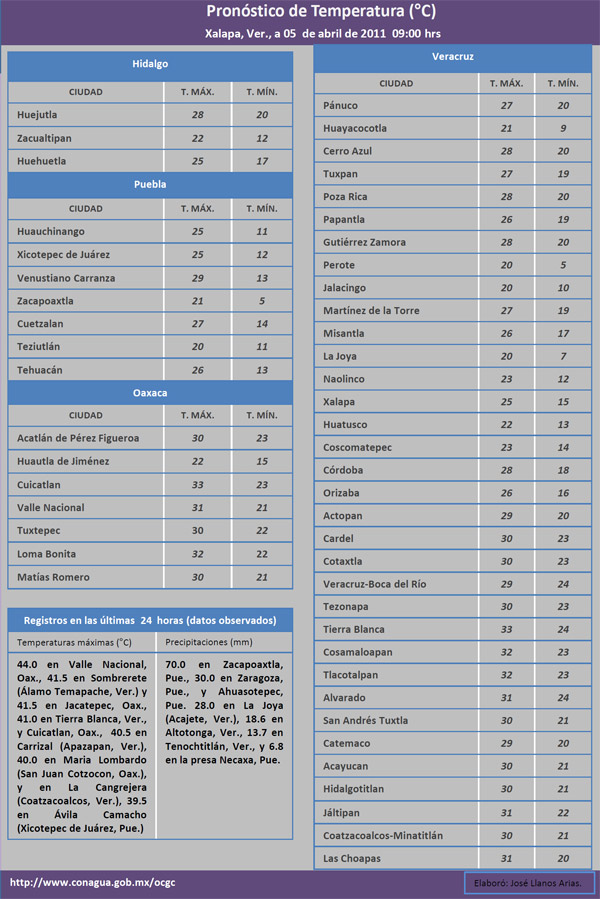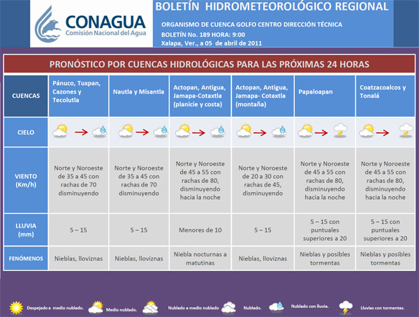 El frente frío No. 39 continuará recorriendo la vertiente oriental del país, siendo posible se localice mañana sobre la península de Yucatán donde tenderá a debilitarse. Por su parte el sistema de alta presión y masa de aire frío que se le asocia cubrirá durante este día el golfo de México, para moverse mañana hacia la costa Este de los Estados Unidos. Ambos sistemas ocasionarán en las próximas 24 horas en la región condiciones para lluvias, disminución de la temperatura diurna y viento del Norte fuerte a violento en la costa, el cual se espera tienda a disminuir gradualmente hacia la tarde o noche.