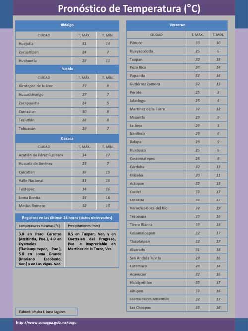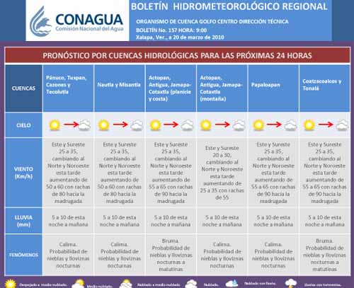 Durante este día en la región seguirá dominando tiempo caluroso. Se espera que el frente frío No. 40 recorra el litoral veracruzano entre esta noche y mañana domingo, ocasionando a su paso por la región aumento de nublados con nieblas, lloviznas, algunas lluvias y cierta probabilidad de tormentas aisladas. Por su parte el sistema de alta presión y masa de aire frío que se le asocia cubrirá la vertiente oriental del país entre esta noche y la madrugada de mañana domingo, favoreciendo disminución de la temperatura y en la costa viento del Norte de 55 a 65 km/h con rachas de 90 km/h.