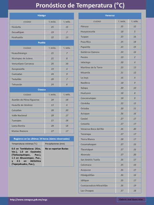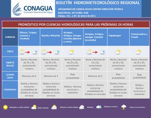 Se espera que un nuevo frente frío se desarrolle sobre el Sur de los Estados Unidos durante esta tarde y se conjunte con el frente frío No. 24, para formar una sola línea frontal la cual podría ubicarse la tarde del martes sobre el Sur de Veracruz. Por su parte, el sistema de alta presión y masa de aire frío que se le asociará tenderá a cubrir la vertiente oriental del país en el transcurso de mañana. Tal situación, ocasionará que el viento de componente Norte se intensifique gradualmente para posiblemente alcanzar el día de mañana velocidades de 35 a 45 km/h con rachas de 65 km/h.