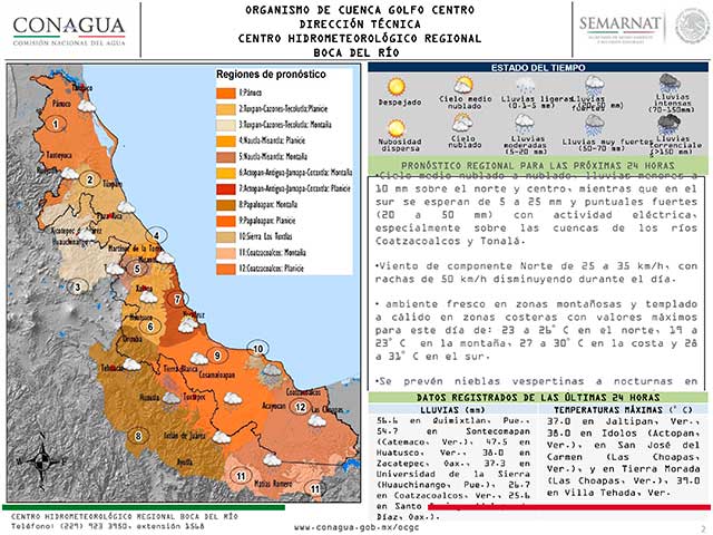 Se espera que el frente número 54 continúe estacionado sobre el suroeste del Golfo de México, mientras que el sistema de alta presión y masa de aire continuará extendido a lo largo de la vertiente oriental del país; dichos sistemas ocasionarán la persistencia de cielo medio nublado a nublado, lluvias menores a 10 mm sobre el norte y centro de la región, mientras que al sur, las lluvias se esperan sean de 5 a 20 mm con eventos localmente fuertes (20 a 50 mm) principalmente sobre las cuencas de los ríos Coatzacoalcos y Tonalá. Es posible que el viento vaya perdiendo intensidad gradualmente durante este día, sin embargo persistirá del Norte de 20 a 30 km/h; en cuanto a la temperatura, se espera mantenga ambiente fresco a templado en zonas montañosas y templado a cálido en zonas costeras.