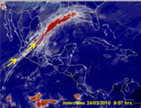 La constante entrada de aire marítimo tropical con bajo contenido de humedad hacia la vertiente oriental del país, sigue ocasionando en la mayor parte de la región que la temperatura diurna registre valores altos y cielo despejado a medio nublado. Sin embargo la corriente de vientos máximos propaga nubosidad alta hacia el Norte y centro de la región. Frente frío No. 41 se localiza sobre el Norte de Texas. El sistema de alta presión y masa de aire frío que se le asocia cubre el Noroeste de los Estados Unidos.
