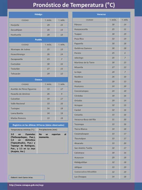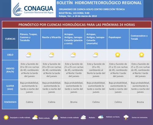 Se espera que en la región persista tiempo caluroso hasta mañana jueves, asimismo se mantiene la probabilidad de un evento de “Surada” durante la madrugada de mañana jueves en las zonas de Orizaba, Los Tuxtlas y parte baja de la cuenca del río Coatzacoalcos con velocidades de 25 a 35 km/h con rachas de 50 km/h. El frente frío No. 41 podría localizarse la tarde del jueves sobre el Norte de Veracruz y sobre el Suroeste del Golfo de México la mañana del viernes, ocasionará a su paso por la región aumento de nublados y condiciones para lluvias especialmente sobre zonas montañosas.