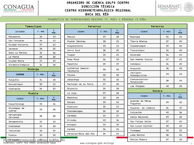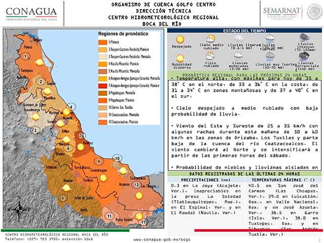 Se prevé que durante este viernes continúe dominando en la región cielo despejado a medio nublado, baja probabilidad de lluvias, viento del Este y Sureste de 25 a 35 km/h y temperatura diurna sensiblemente alta. Dichas condiciones tenderán a cambiar el día de mañana debido al avance del sistema frontal No. 46 y al establecimiento de un canal de baja presión en el suroeste del Golfo de México, mismos que provocarán que aumenten los nublados y la probabilidad de lluvias moderadas a localmente fuertes, acompañadas por tormentas eléctricas, entre la tarde del sábado a mañana del domingo, principalmente en el norte, zonas montañosas y sur de la región. Asimismo, el viento cambiará al Norte durante esta noche y se intensificará, alcanzando velocidades sostenidas de 30 a 40 km/h y rachas de 60 a 70 km/h en la costa entre la mañana del sábado a primeras horas del domingo. La temperatura descenderá mañana y el domingo, ocasionando un ambiente cálido a caluroso el día sábado y templado a cálido el mismo domingo en la mayor parte de la región.