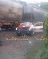 El accidente se registró cuando presuntamente el ruletero intentó ganarle el paso al ferrocarril, siendo embestido por la locomotora que lo proyectó fuera de las vías, quedando la unidad severamente dañada a un costado del camino.