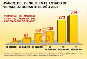 En una semana el dengue en el estado de Veracruz se incrementó en 22.3 por ciento, con respecto a la anterior, sumando al 17 de febrero 334 casos, la cifra mas alta del país, esto con base en datos de la Secretaría de Salud del Gobierno federal.