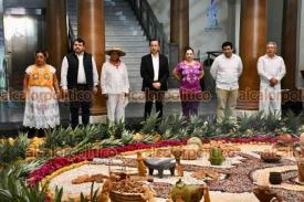 Integrantes de la etnia mixe-popoluca instalaron una ofrenda de Todos Santos en el patio central del Palacio de Gobierno, como parte de las actividades del TsuTsin o “Fiesta de Muertos” en su lengua originaria.