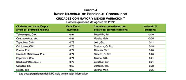 Por ciudades, Tehuantepec, Oaxaca, es la ciudad más cara del país con una inflación de 0.91 por ciento; le sigue Coatzacoalcos, con 0.81 por ciento y Tapachula con una inflación de 0.76 por ciento.