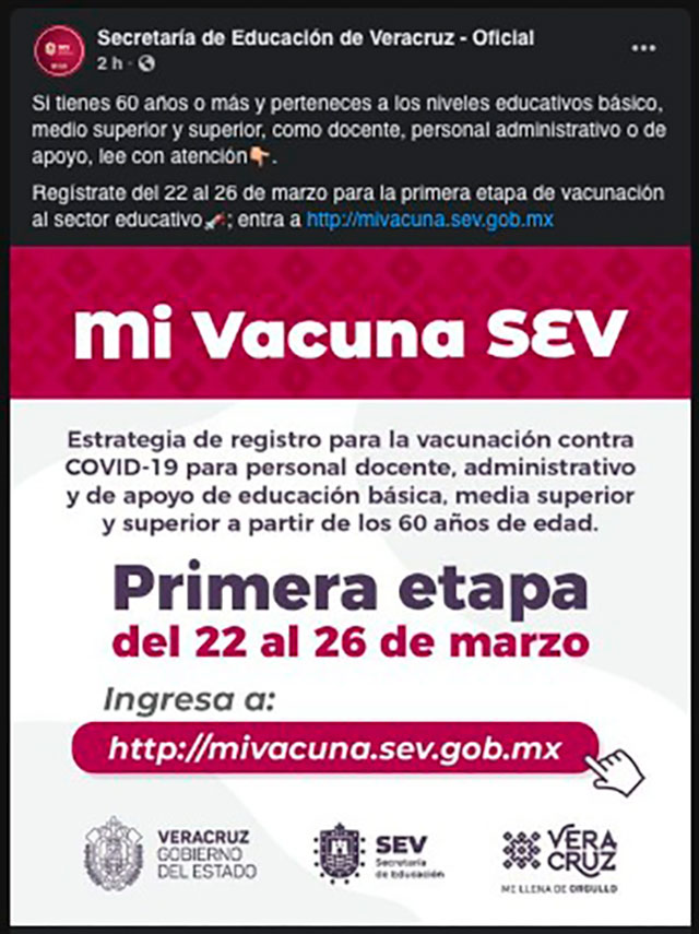 A través de sus redes sociales, la SEV invitó a docentes de todos los niveles, así como a personal administrativo o de apoyo, a registrarse de este lunes y hasta el 26 de marzo para la primera etapa de vacunación del sector educativo.
