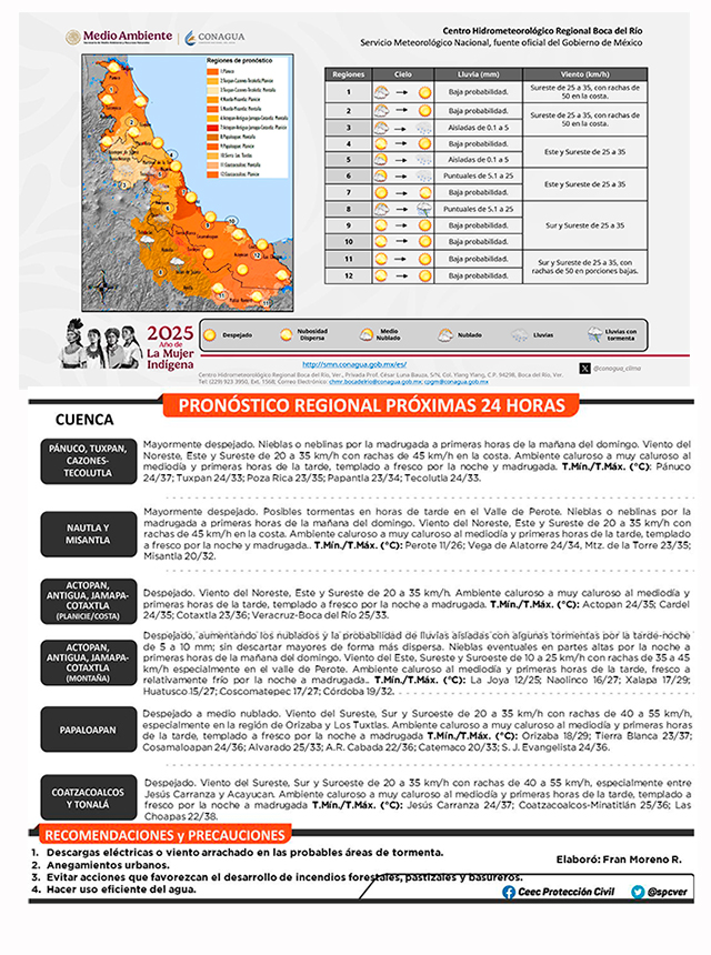 Se prevé un evento de surada en la parte alta de Orizaba, Los Tuxtlas y Jesús Carranza-Acayucan con rachas de 40 a 55 kilómetros por hora. Bajo potencial de lluvias, sin descartar algunas tormentas en regiones de montaña, ambiente diurno cálido. Tome precauciones.