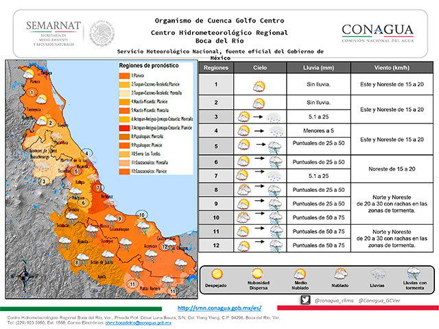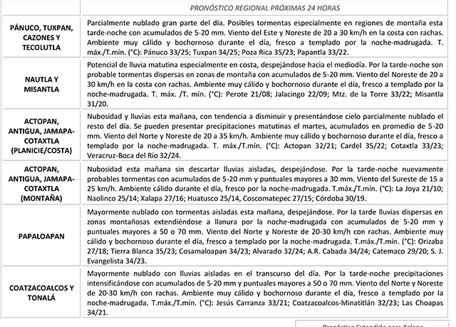 Durante los próximos días se prevén condiciones normales de la época, presentándose lluvias y tormentas moderadas a fuertes en horas de la madrugada o mañana sobre costas y llanura de Veracruz, mientras que en zonas montañosas las precipitaciones serían vespertinas a nocturnas generando acumulados de 5-20 mm y puntuales superiores a 50 ó 70 mm especialmente en el sur del Estado límites con Oaxaca, Chiapas y Veracruz hoy lunes, las cuales pueden incrementarse debido al paso de la Onda Tropical número 34 en el transcurso de mañana martes, siendo probables encharcamientos.