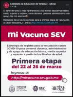 En seguimiento a la estrategia federal de vacunación contra el coronavirus, a partir de las 13:00 horas de este lunes la Secretaría de Educación de Veracruz (SEV) habilitó la plataforma http://mivacuna.sev.gob.mx, para el registro de trabajadores de 60 años y más.