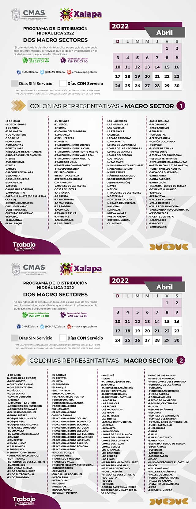 Además, informa que a partir de este sábado 16 de abril las colonias de los Macro Sectores 1 y 2 se amplían derivado de la misma temporada de estiaje y se establece el calendario de tandeos que se puede consultar y descargar en formato PDF en la liga: