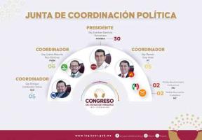 De esta manera, la Jucopo queda conformada de la siguiente manera con los grupos legislativos, sus coordinadores y el número de integrantes: Morena, Esteban Bautista Hernández, con 30; Partido Verde Ecologista de México (PVEM), Carlos Marcelo Ruiz Sánchez, seis; Partido Acción Nacional (PAN), Enrique Cambranis Torres, cinco; y Partido del Trabajo (PT), Ramón Díaz Ávila, con cinco.