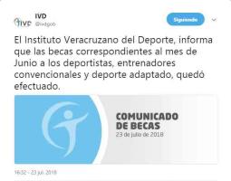 Aunque el Instituto Veracruzano del Deporte (IVD) anunció este lunes 23 de julio que el pago correspondiente a las becas deportivas por el mes de julio ya había quedado saldado, el tenista cordobés Santiago González exhibió a la dependencia, pues acusó que él aún espera su pago desde enero.
