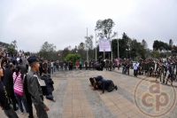 Esperaron varias horas, pero al final los integrantes del Pentathlón Deportivo Militarizado Universitario AC, pudieron hacer una demostración al gobernador Javier Duarte de Ochoa de las acrobacias y la disciplina militarizada que ejecutan.
