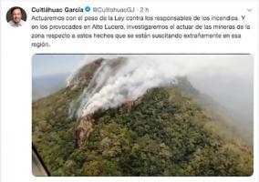 “Actuaremos con el peso de la Ley contra los responsables de los incendios. Y en los provocados en Alto Lucero, investigaremos el actuar de las mineras de la zona respecto a estos hechos que se están suscitando extrañamente en esa región”, posteó el mandatario en sus redes sociales.